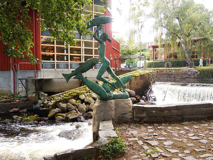 Skulpturen "Laksepigen", med restauranten i baggrunden.