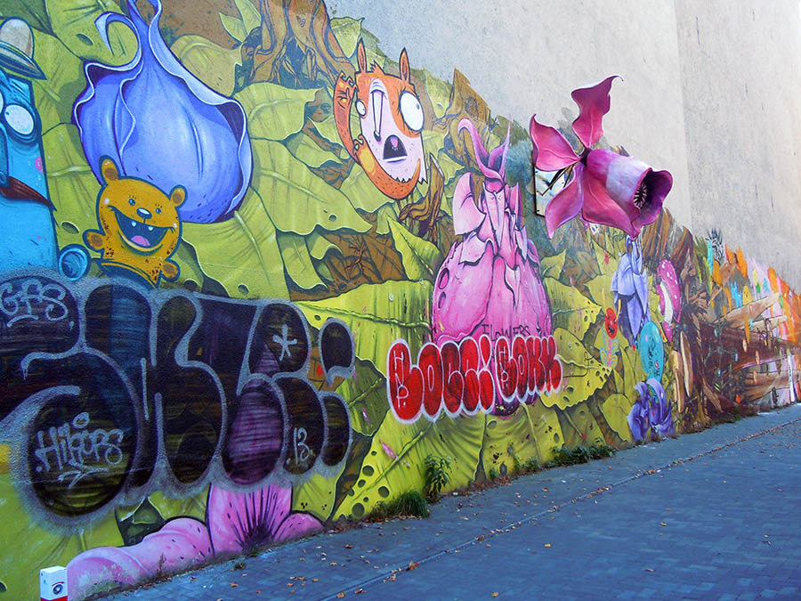 Graffiti og malerier ved indgangen til en legeplads ved markedet.