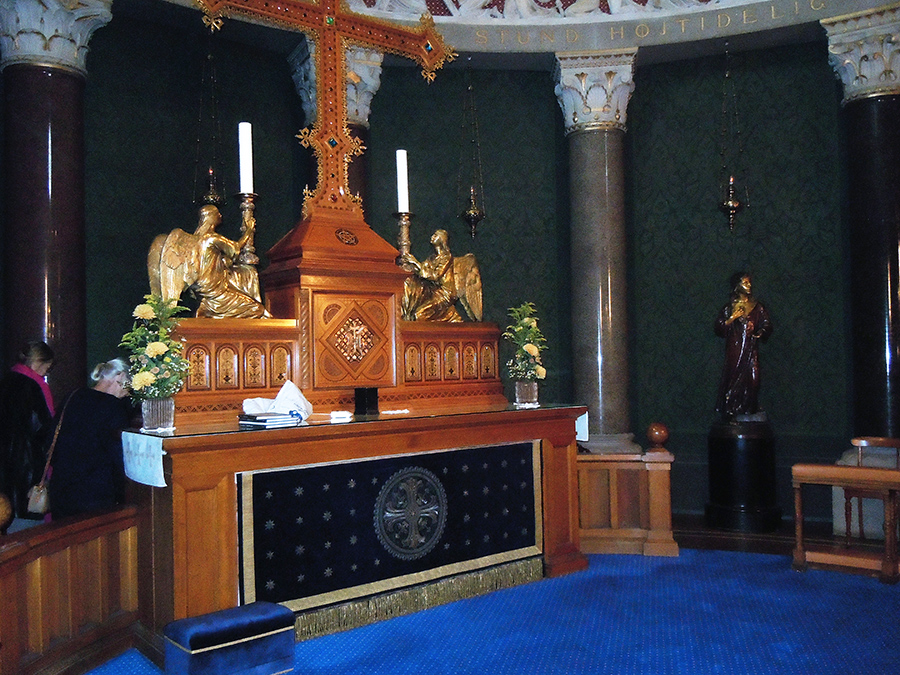 Alteret i kirken. Søjlerne er forskellige. Bag alteret er nedgangen til krypten.