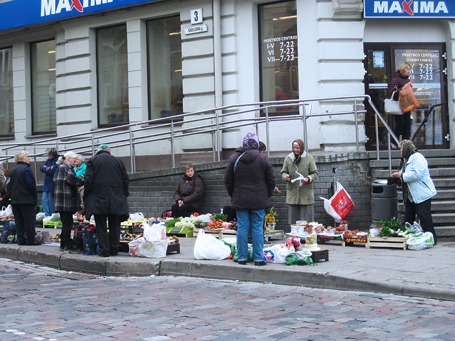 med de lokale handlende på fortovet udenfor.