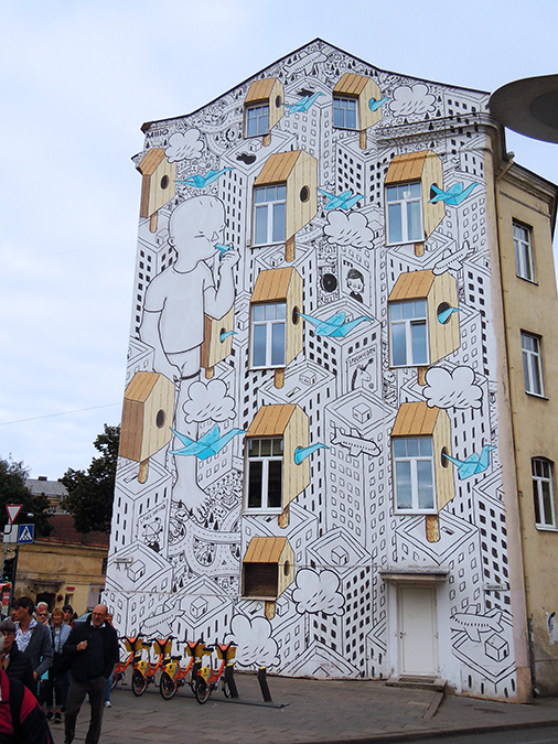 En slidt gammel boligmasse, - og så det moderne vægmaleri og bycykler.