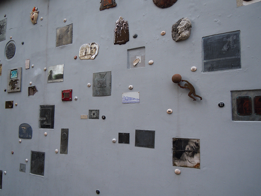Væg med små kunstværker i Vilnius by.