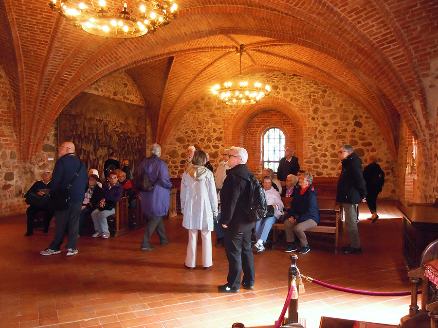 Vores guide, Karin Larsen, kigger med i riddersalen, som også bliver brugt til fine modtagelser.